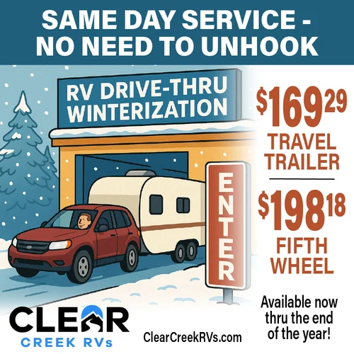 RV Drive-Thru Winterization. Available now! See store for full terms and details.